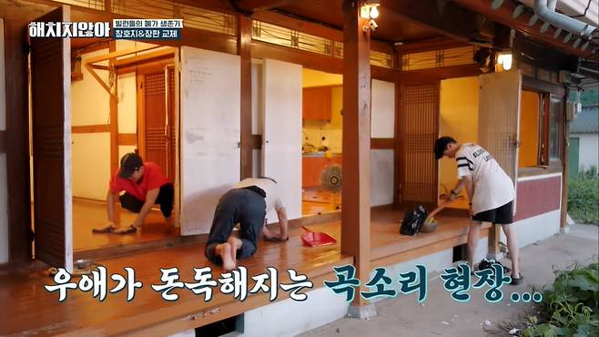 이날 아지트에 도착하자마자 잡초를 뽑고 문풍지를 새로 바르는 등 노동을 이어온 세 사람은 마룻바닥에 쌓인 먼지를 닦아내기 위한 걸레질에 나섰다.