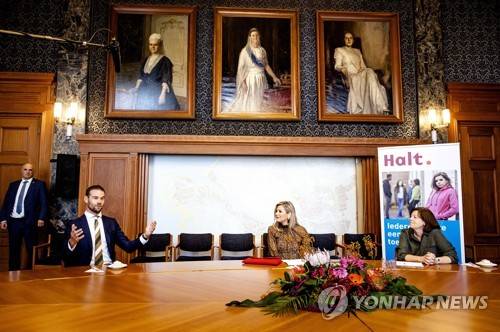 epa09492984 Queen Maxima talks with employees of the Halt Foundation during a working visit on the occasion of the foundation's 40th anniversary, Rotterdam, Netherlands, 28 September 2021. EPA/SEM VAN DER WAL
