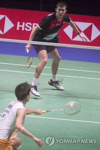 epa09493311 Johnnie Totjussen (top) of England in action during the Men's Singles match against Kento Momota of Japan at the 2021 Sudirman Cup tie Japan vs England in Vantaa Finland, Finland, 28 September 2021. EPA/MAURI RATILAINEN