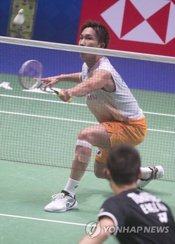 epa09493316 Kento Momota of Japan in action during the Men's Singles match against Johnnie Totjussen of England at the 2021 Sudirman Cup tie Japan vs England in Vantaa Finland, Finland, 28 September 2021. EPA/MAURI RATILAINEN
