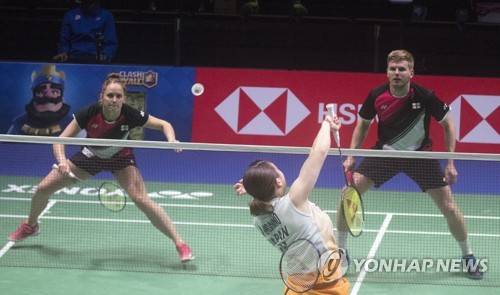 epa09493482 Mied Douples Yuta Watanabe and Arisa Higashino of Japan and Marcus Ellis and Lauren Smith of England (top) in action during the mixed doubles match at the 2021 Sudirman Cup tie Japan vs England in Vantaa Finland, Finland, 28 September 2021. EPA/MAURI RATILAINEN