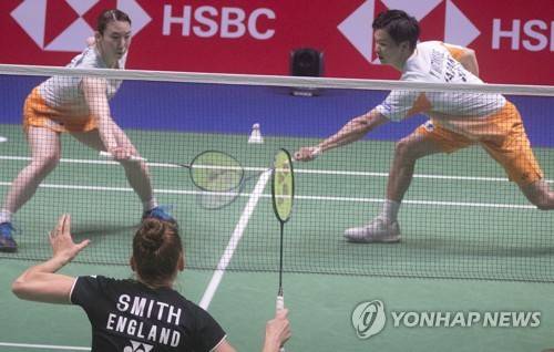 epa09493483 Mied Douples Yuta Watanabe and Arisa Higashino of Japan (top) and Marcus Ellis and Lauren Smith of England in action during the mixed doubles match at the 2021 Sudirman Cup tie Japan vs England in Vantaa Finland, Finland, 28 September 2021. EPA/MAURI RATILAINEN