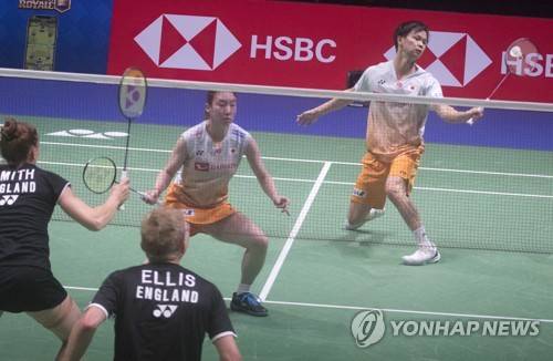 epa09493487 Mied Douples Yuta Watanabe and Arisa Higashino of Japan (top) and Marcus Ellis and Lauren Smith of England in action during the mixed doubles match at the 2021 Sudirman Cup tie Japan vs England in Vantaa Finland, Finland, 28 September 2021. EPA/MAURI RATILAINEN
