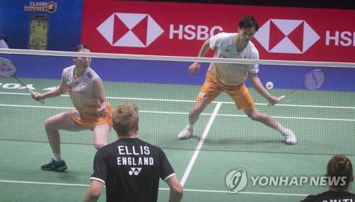 epa09493485 Mied Douples Yuta Watanabe and Arisa Higashino of Japan (top) and Marcus Ellis and Lauren Smith of England in action during the mixed doubles match at the 2021 Sudirman Cup tie Japan vs England in Vantaa Finland, Finland, 28 September 2021. EPA/MAURI RATILAINEN