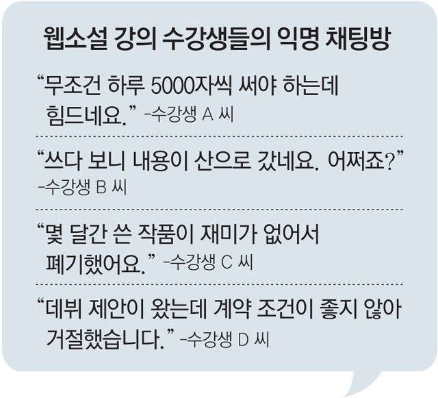 최근 웹소설 전문학원 스토리튠즈 수강생 80여 명이 모인 익명 채팅방에 한 수강생이 올린 글이다. 자칭 웹소설 마니아로 대박을 꿈꾸며 웹소설 강의를 듣기 시작했지만 현실은 만만치 않다는 것. 다른 수강생들도 “작가로 데뷔하면 매일 5000자씩 써야 하는데 걱정이 앞선다” “취미가 일이 되니 흥미가 사라졌다”며 하소연했다.
