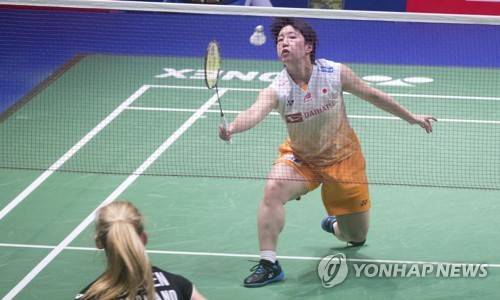 epa09493723 Yamaguchi Akar (top) of Japan and Holden Abigail of England in action during the women's singles match at the 2021 Sudirman Cup tie Japan vs England in Vantaa Finland, Finland, 28 September 2021. EPA/MAURI RATILAINEN