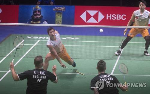 epa09493916 Akira Koga and Taishi Saito of Japan (top) and Ben Lane and Sean Vendy of England in action during the men's doubles match at the 2021 Sudirman Cup tie Japan vs England in Vantaa Finland, Finland, 28 September 2021. EPA/MAURI RATILAINEN