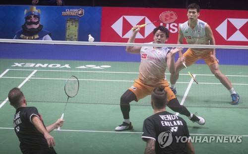 epa09493922 Akira Koga and Taishi Saito of Japan (top) and Ben Lane and Sean Vendy of England in action during the men's doubles match at the 2021 Sudirman Cup tie Japan vs England in Vantaa Finland, Finland, 28 September 2021. EPA/MAURI RATILAINEN