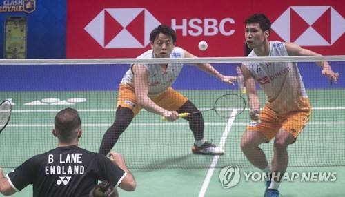 epa09493924 Akira Koga and Taishi Saito of Japan (top) and Ben Lane and Sean Vendy of England in action during the men's doubles match at the 2021 Sudirman Cup tie Japan vs England in Vantaa Finland, Finland, 28 September 2021. EPA/MAURI RATILAINEN