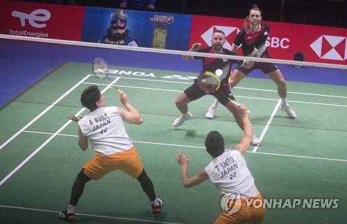 epa09493929 Akira Koga and Taishi Saito of Japan (front) and Ben Lane and Sean Vendy of England in action during the men's doubles match at the 2021 Sudirman Cup tie Japan vs England in Vantaa Finland, Finland, 28 September 2021. EPA/MAURI RATILAINEN