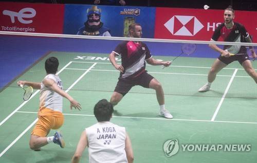 epa09493930 Akira Koga and Taishi Saito of Japan (front) and Ben Lane and Sean Vendy of England in action during the men's doubles match at the 2021 Sudirman Cup tie Japan vs England in Vantaa Finland, Finland, 28 September 2021. EPA/MAURI RATILAINEN