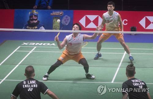 epa09493923 Akira Koga and Taishi Saito of Japan (top) and Ben Lane and Sean Vendy of England in action during the men's doubles match at the 2021 Sudirman Cup tie Japan vs England in Vantaa Finland, Finland, 28 September 2021. EPA/MAURI RATILAINEN