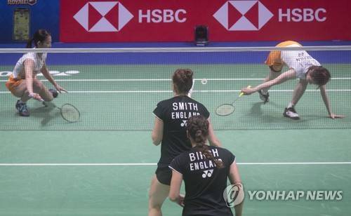 epa09494071 Nami Matsuyama and Chiharu Shida of Japan (top) and Chloe Birch and Lauren Smith of England in action during the women's doubles match at the 2021 Sudirman Cup tie Japan vs England in Vantaa Finland, Finland, 28 September 2021. EPA/MAURI RATILAINEN