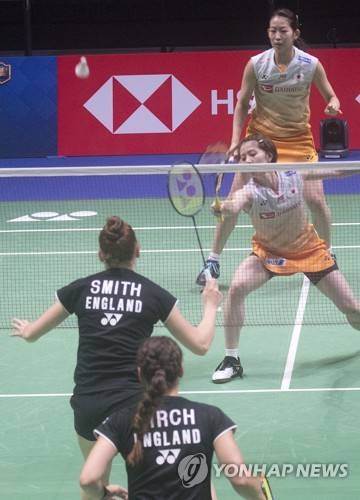 epa09494086 Nami Matsuyama and Chiharu Shida of Japan (top) and Chloe Birch and Lauren Smith of England in action during the women's doubles match at the 2021 Sudirman Cup tie Japan vs England in Vantaa Finland, Finland, 28 September 2021. EPA/MAURI RATILAINEN