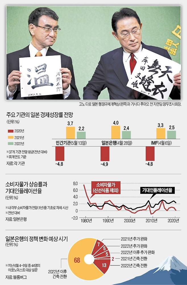 일본 자민당 총재 선거가 오늘 치러진다. 고노 다로 일본 행정규제개혁상이 선두를 달리는 가운데 이번 선거의 당선자는 다음달 4일 소집되는 임시총회를 거쳐 일본 총리로 확정된다. 작년 8월 말 아베 신조 총리가 조기 사임한 데 이어 그의 대리인 격인 스가 요시히데 현 총리까지 불출마를 선언함에 따라 차기 정부 들어 일본에 커다란 변화가 일어날 것으로 예상된다. 정치적으로 1953년 이후 무려 70년 동안 지속돼온 ‘자민당 내 계파 정치가 마무리될 것인가’와 경제정책으로는 햇수로 10년째를 맞은 ‘아베노믹스가 어떻게 될 것인가’가 최대 관심사다.