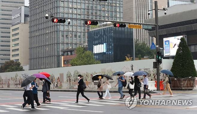(서울=연합뉴스) 백승렬 기자 = 가을비가 내린 29일 오전 서울시 종로구 광화문광장 인근 횡단보도에서 시민들이 우산을 쓰고 출근하고 있다. 2021.9.29