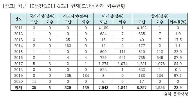 29일 국회 문화체육관광위원회 소속 더불어민주당 정청래 의원실이 문화재청으로 받은 자료를 분석한 결과에 따르면 최근 10년 간 도난된 8297점의 문화재 중 1986건만이 회수돼 회수율이 23.9%에 불과했다.