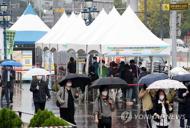 (서울=연합뉴스) 임헌정 기자 = 가을비가 내린 29일 서울역 앞에서 우산을 쓴 시민들이 발걸음을 재촉하고 있다. 2021.9.29