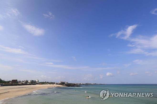 (제주=연합뉴스) 박지호 기자 = 29일 오전 제주시 애월읍 곽지해변에서 서퍼들이 파도를 즐기고 있다. 2021.9.29