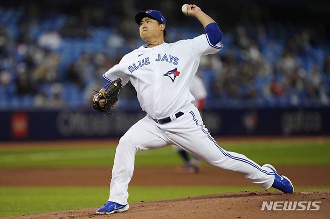 [토론토=AP/뉴시스] 토론토 블루제이스 류현진이 28일(현지시간) 캐나다 토론토의 로저스센터에서 열린 2021 메이저리그(MLB) 뉴욕 양키스와의 경기에 선발 등판해 1회 투구하고 있다. 류현진은 4⅓이닝 6피안타 1볼넷 3탈삼진 3실점 하며 팀이 2-3으로 뒤진 상황에서 교체됐다. 2021.09.29.