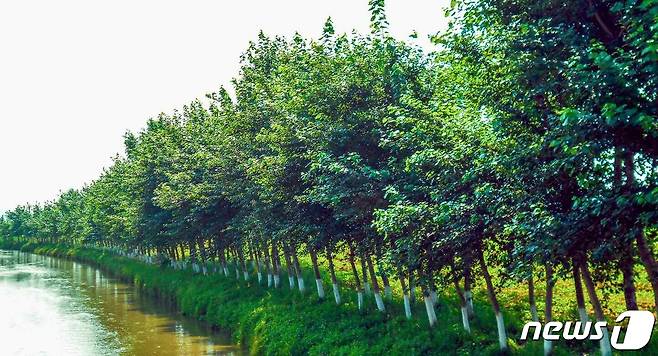 (평양 노동신문=뉴스1) = 북한 노동당 기관지 노동신문은 29일 "무본천 제방뚝을 따라 뻗어나간 상원뽀뿌라(포푸리)나무들"이라며 관련 사진을 실었다. 신문은 상원보뿌라나무를 비롯한 나무들을 강하천 제방뚝들에 많이 심는 사업은 "군 당 위원회가 국토관리사업에 대한 조직정치사업을 빈틈없이 짜고든 데 있다"라고 설명했다.