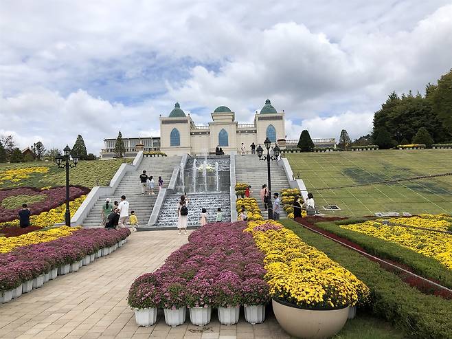 | ▲ 치즈캐슬 임실치즈테마파크의 중심 풍경이다. 국화꽃이 가을을 열고 있다. |