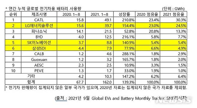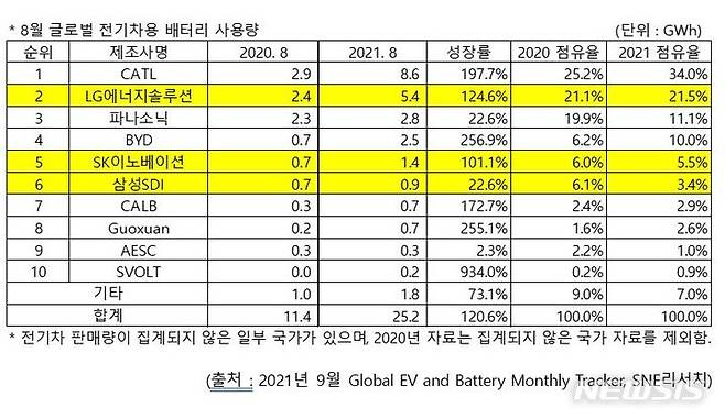 한편, 2021년 8월 글로벌 전기차 배터리 사용량은 25.2GWh로 전년 동월 대비 2.2배 늘었다. 전기차 배터리 시장이 코로나 사태 영향에서 벗어나 14개월째 회복세를 보였다. 중국과 미국, 유럽 등 주요 시장 모두 성장세를 나타낸 가운데, 업체별로는 상당수 중국계 업체들이 세 자릿수 증가세로 시장 성장을 견인했다.
