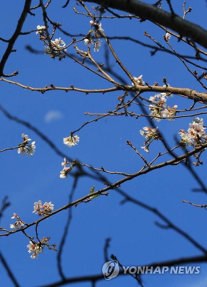 (제주=연합뉴스) 박지호 기자 = 29일 오전 제주시 오라동의 주택가에 벚꽃이 피어 눈길을 끌고 있다. 2021.9.29