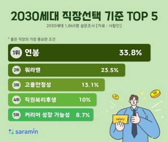구인구직 매칭 플랫폼 사람인(대표 김용환)이 최근 2030세대 1천865명을 대상으로 직장 선택 기준을 물은 결과 '연봉'(33.8%)이 1순위로 꼽혔다고 29일 밝혔다.