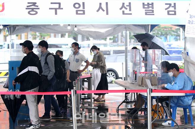 [이데일리 김태형 기자] 가을을 재촉하는 비가 내리는 가운데 29일 오전 서울역광장 코로나19 임시선별검사소에서 시민들이 검사를 받고 있다.
