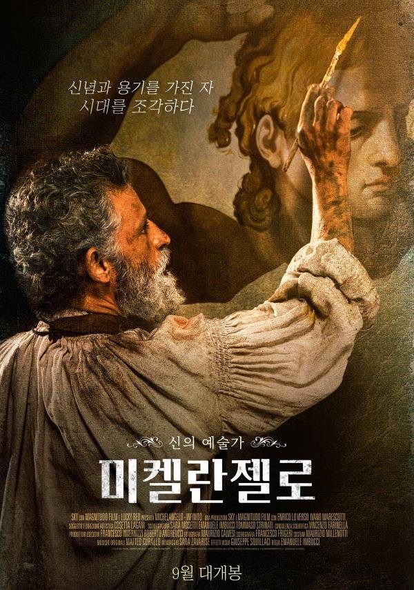 '미켈란젤로' 메인 포스터에는 섬세한 손길로 그림을 그리는 미켈란젤로 모습이 담겼다. "신념과 용기를 가진 자, 시대를 조각하다"라는 카피가 영화 전반 내용을 관통한다. 또 '천지창조' '다비드상' '피에타상' '모세상' 등 미켈란젤로 명작들이 눈길을 끈다.