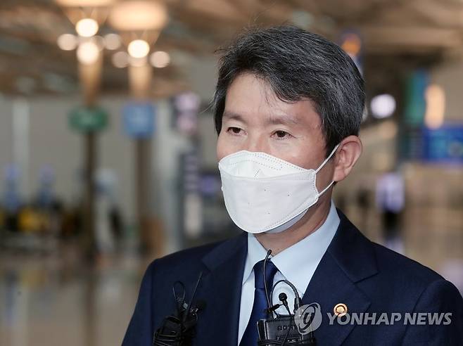 (영종도=연합뉴스) 임헌정 기자 = 독일 통일행사 참석 등 유럽 순방에 나서는 이인영 통일부 장관이 29일 영종도 인천국제공항 제1여객터미널에서 출국에 앞서 취재진 질문에 답하고 있다. 2021.9.29