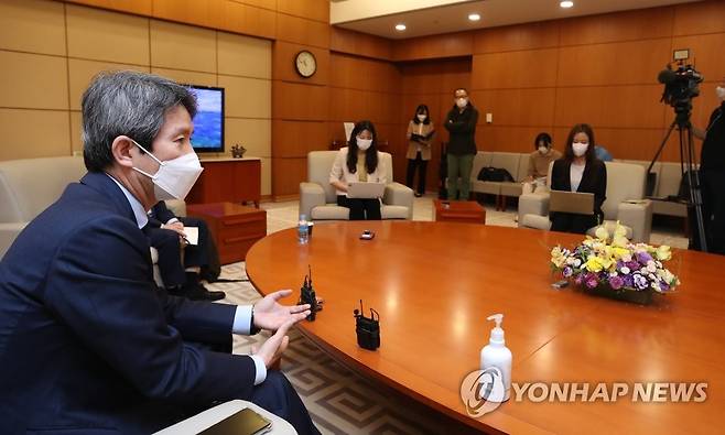 (영종도=연합뉴스) 임헌정 기자 = 독일 통일행사 참석 등 유럽 순방에 나서는 이인영 통일부 장관이 29일 영종도 인천국제공항 제1여객터미널 귀빈실에서 출국에 앞서 기자단과 간담회를 하고 있다. 2021.9.29