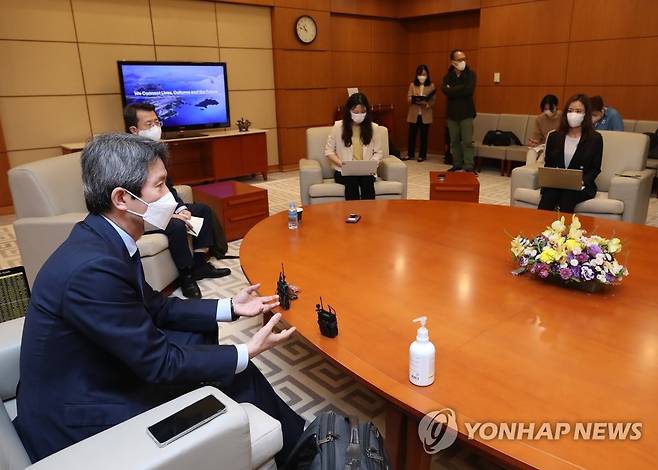 (영종도=연합뉴스) 임헌정 기자 = 독일 통일행사 참석 등 유럽 순방에 나서는 이인영 통일부 장관이 29일 영종도 인천국제공항 제1여객터미널 귀빈실에서 출국에 앞서 기자단과 간담회를 하고 있다. 2021.9.29