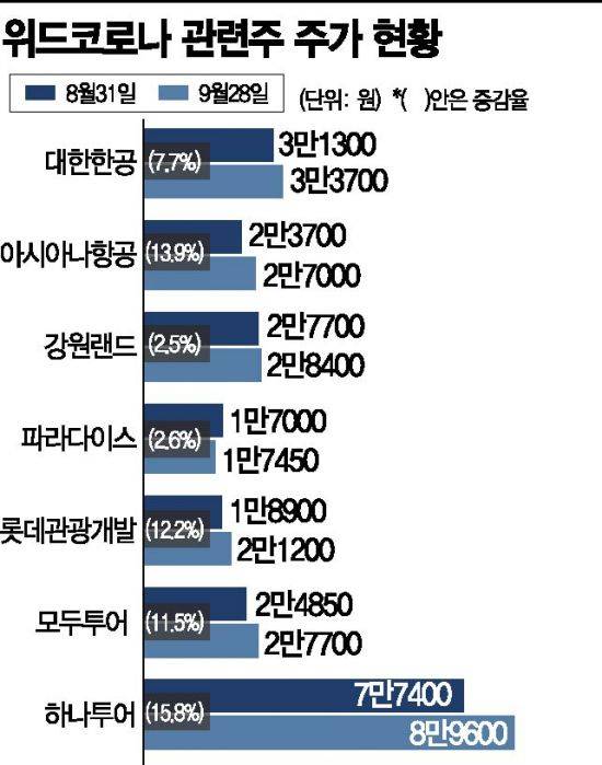 29일 한국거래소에 따르면 이달 들어 대한항공, 아시아나항공, 모두투어, 하나투어 등 항공·여행업종 주가는 각각 7.7%, 13.9%, 11.5%, 15.8% 급등했다. 롯데관광개발(12.2%), 강원랜드(2.5%), 파라다이스(2.6%) 등 카지노 업종도 동반 상승세를 탔다. 같은 기간 코스피 수익률이 -3.2%로 뒷걸음질 친 것과 상반된다. 국내 증시가 미국 연방준비제도(Fed) 테이퍼링(자산 매입 축소) 임박과 중국의 헝다그룹 파산 우려, 기업 실적 전망 둔화 등으로 부진한 흐름을 보인 반면 위드 코로나 도입은 점차 가시화된 분위기가 반영된 것으로 보인다. 정부는 위드 코로나 전환 시점으로 인구 대비 코로나19 백신 접종 완료율이 70%에 이르는 10월 말∼11월 초를 제시했다.