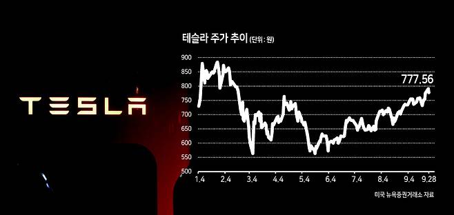 29일 금융투자업계에 따르면 테슬라는 지난 5월 중순 이후 꾸준히 우상향을 그리고 있다. 최근 4개월 간 25% 가까이 급등한 가운데 최근 한 달 동안에만 6.38% 올랐다. 지난 27일엔 800달러까지 근접하며 지난 2월 초 주가 수준을 회복했다.