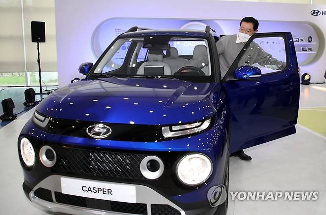 (광주=연합뉴스) 조남수 기자 = 29일 오전 광주광역시청 시민홀에서 열린 캐스퍼 차량전시관 오픈 행사에서 이용섭 광주시장이 전시된 블루색 차량에 탑승하고 있다. 캐스퍼는 '광주형 일자리' 사업으로 탄생한 현대차의 첫 경형 스포츠유틸리티차(SUV)로 광주글로벌모터스(GGM)에서 위탁 생산한다. 2021.9.29