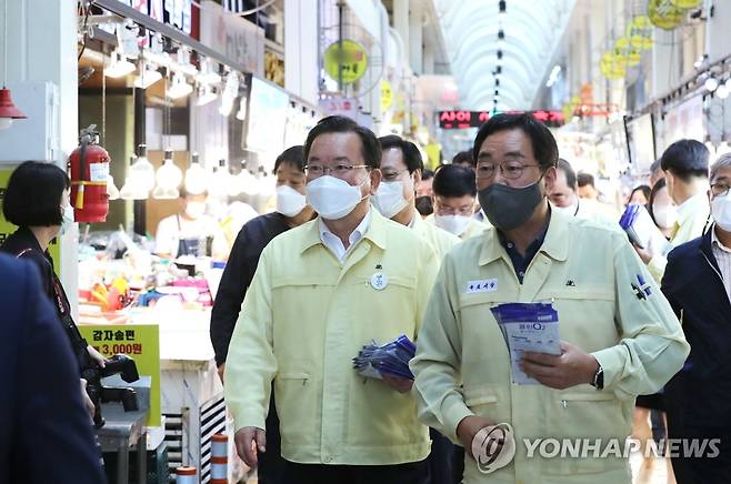 (속초=연합뉴스) 김주형 기자 = 김부겸 국무총리(왼쪽)가 29일 오전 방역 점검 등을 위해 강원도 속초시 속초관광수산시장을 방문해 김철수 속초시장과 현장을 둘러보고 있다. 2021.9.29