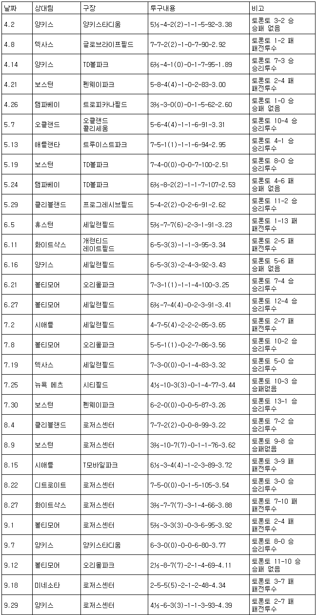 ※ 투구 내용은 이닝-피안타-실점(자책점)-피홈런-볼넷-탈삼진-투구 수-시즌 평균자책점 순.
