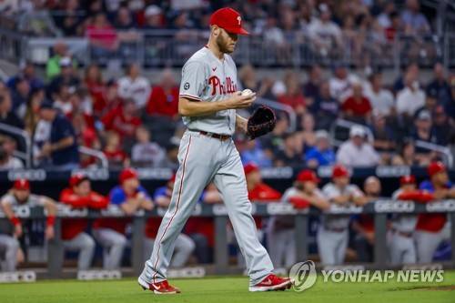 epa09494644 Philadelphia Phillies starting pitcher Zack Wheeler reacts to an Atlanta Braves rally in the third inning of an MLB baseball game between the Philadelphia Phillies and the Atlanta Braves at Truist Park in Atlanta, Georgia, USA, 28 September 2021. EPA/ERIK S. LESSER