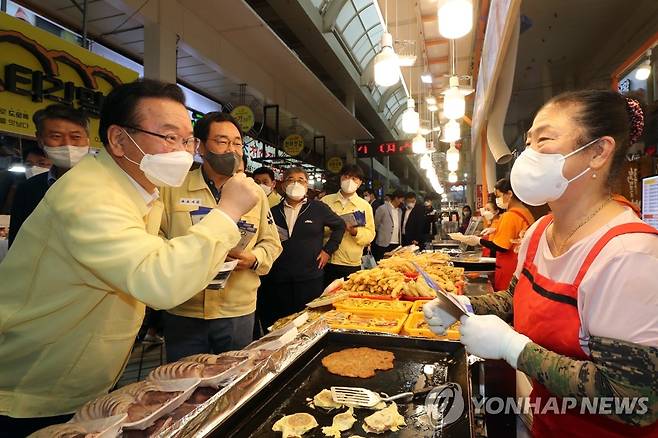 (속초=연합뉴스) 김주형 기자 = 김부겸 국무총리가 29일 오전 강원도 속초시 속초관광수산시장을 방문해 방역 점검 및 상인을 격려하고 있다. 2021.9.29