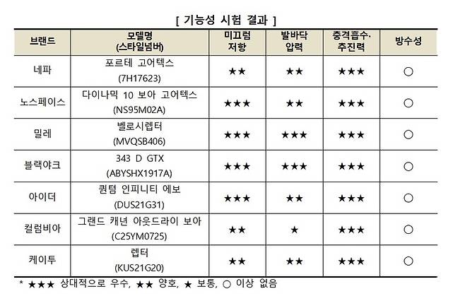 발바닥 압력은 밀레, 블랙야크 등 2개 제품이 다른 제품에 비해 보행 시 발바닥에 전달되는 압력이 낮아 착화감이 상대적으로 우수했다. 걸을 때 신발이 충격을 감소시키는 정도인 충격 흡수와 걷는 방향으로 밀어주는 추진력도 우수했다. 비나 눈이 신발 내부로 새어 들어오는 정도를 시험한 결과에서도 모든 제품의 신발 내부가 젖지 않아 방수에 이상이 없었다.