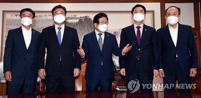 (서울=연합뉴스) 하사헌 기자 = 박병석 국회의장과 여야 원내대표가 29일 국회 의장실에서 열린 국회의장 주재 언론중재법 관련 회동에서 기념촬영을 하고 있다. 왼쪽부터 더불어민주당 한병도 원내수석부대표, 윤호중 원내대표, 박 의장, 국민의힘 김기현 원내대표, 추경호 원내수석부대표. 2021.9.29 [국회사진기자단]