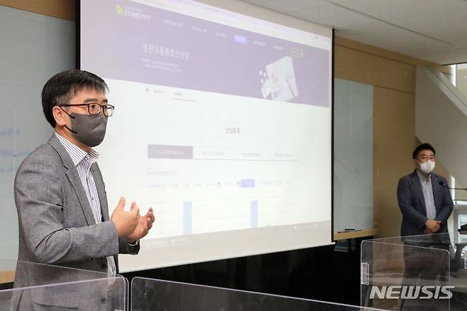 [서울=뉴시스] 박진희 기자 = 한국출판문화산업진흥원 박찬수(왼쪽) 사무처장과 김진형 산업지원본부장이 29일 서울 마포구 서울산업진흥원에서 언론 대상 출판유통통합전산망 시연을 마치고 질의에 답변을 하고 있다. 2021.09.29. pak7130@newsis.com