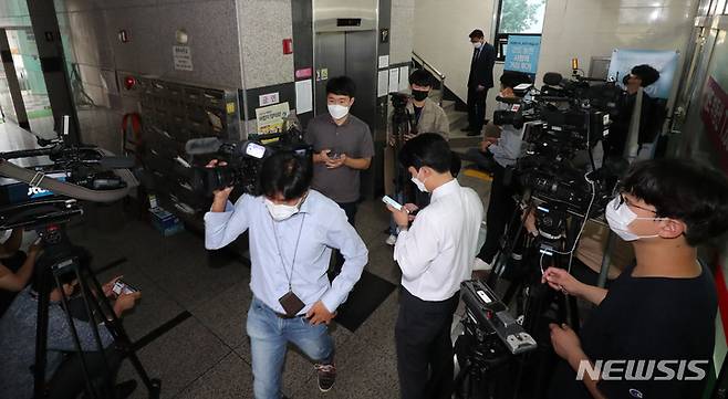[성남=뉴시스] 김종택기자 = 29일 오전 검찰의 압수수색이 진행 중인 경기도 성남시 자산관리회사 화천대유 사무실 건물 1층에 취재진이 대기하고 있다. 이날 검찰은 화천대유 최대주주인 김만배씨와 유동규 전 성남도시개발공사 사장 직무대행의 주거지를 비롯해 천화동인 2∼7호 실소유주들의 주거지 등을 압수수색하며 본격적인 수사에 들어갔다. 2021.09.29.