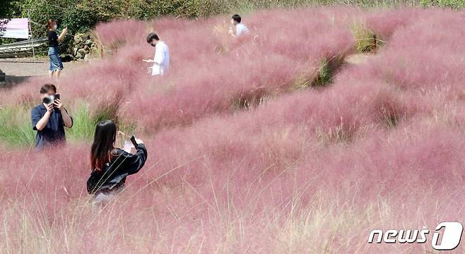 (서귀포=뉴스1) 오현지 기자 = 29일 오후 제주 서귀포시 남원읍 휴애리자연생활공원 핑크뮬리 정원에서 관광객들이 가을 정취를 느끼고 있다. 2021.9.29/뉴스1