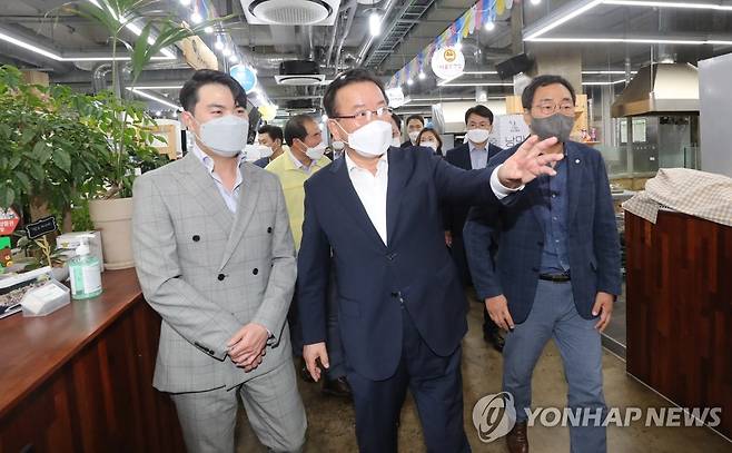 (속초=연합뉴스) 김주형 기자 = 김부겸 국무총리가 29일 오후 강원도 속초시 중앙동에 있는 속초 청년몰을 방문해 박현수 청년몰 회장으로부터 현황보고를 받고 있다. 2021.9.29