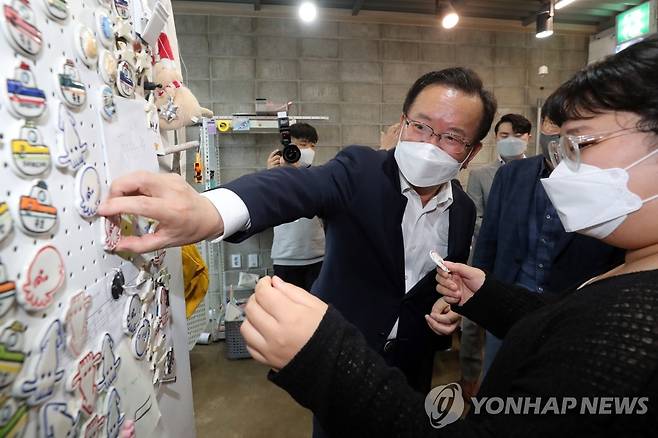(속초=연합뉴스) 김주형 기자 = 김부겸 국무총리가 29일 오후 강원도 속초시 중앙동에 있는 속초 청년몰을 방문해 둘러보고 있다. 2021.9.29