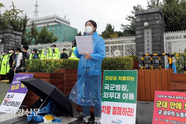 국군병원 등 군에서 근무하는 공무직 노동자들이 29일 서울 용산구 국방부 정문 앞에서 군 공무직 노동자 차별 철폐를 촉구하는 기자회견을 열고 있다.