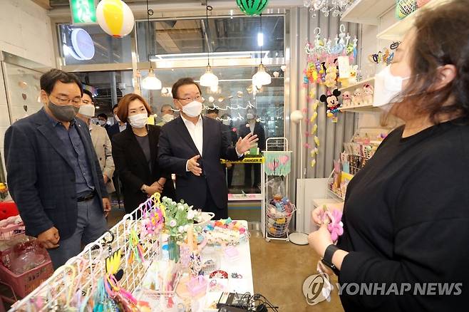 (속초=연합뉴스) 김주형 기자 = 김부겸 국무총리가 29일 오후 강원도 속초시 중앙동에 있는 속초 청년몰을 방문해 둘러보고 있다. 2021.9.29